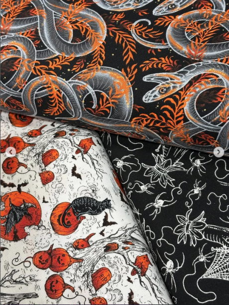 Costumes et Toiles d'Araignées ( Costumes & Cobwebs ) est la dernière collection d'Halloween de la famille Club Hauer. Avec un équilibre entre fantaisie et frissons, cette collection essaie d'avoir tout. Alors, secouez ces toiles d'araignées de la machine à coudre, mais n'oubliez pas d'en laisser quelques-unes pour la décoration.