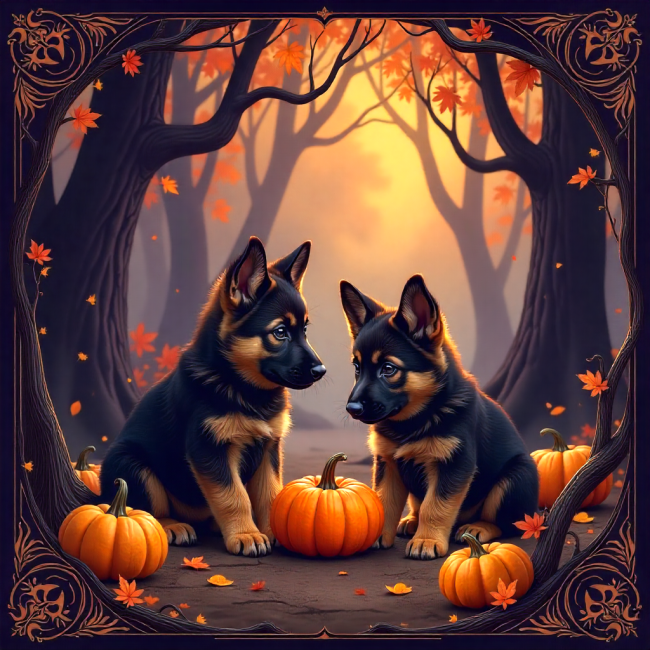 COUPON DUO CHIOTS BERGERS ALLEMANDS CITROUILLES 20X20 - tissu 100% coton