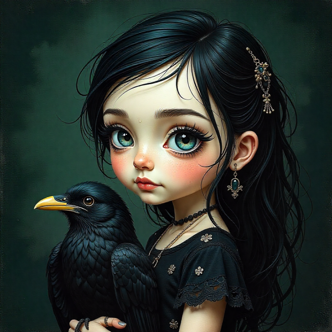 COUPON FILLETTE GOTHIQUE ET SON CORBEAU 20X20. - tissu 100% coton