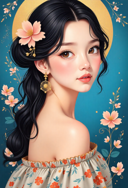 COUPON ASIAN GIRL FOND BLEU SOLEIL JAUNE 16X23 - tissu 100% coton
