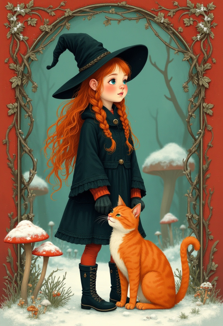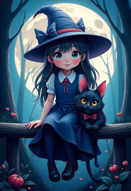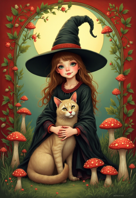COUPON SORCIERE ASSISE SUR BRANCHE CHAT NOIR OREILLES ROSES 16X23 - tissu 100% coton