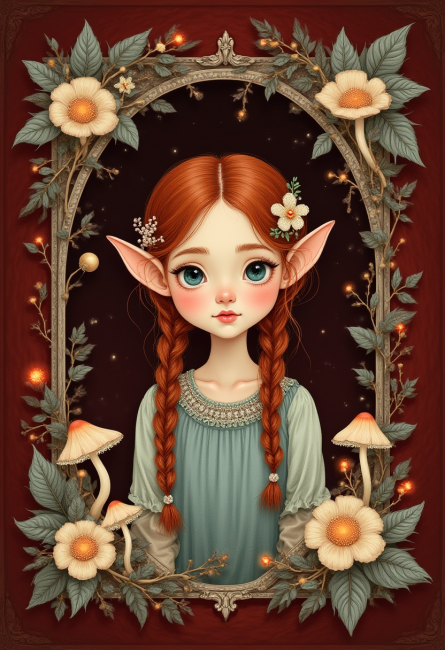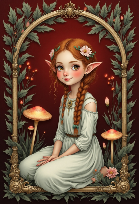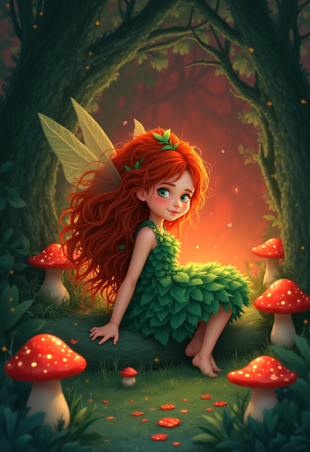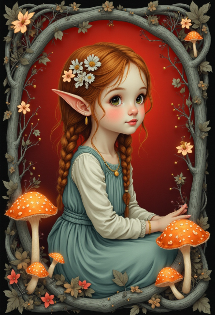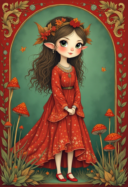 COUPON ELFE ET CHAMPIGNONS ROBE ROUGE DE 3/4 FOND ROUGE VERT 16X23 - tissu 100% coton