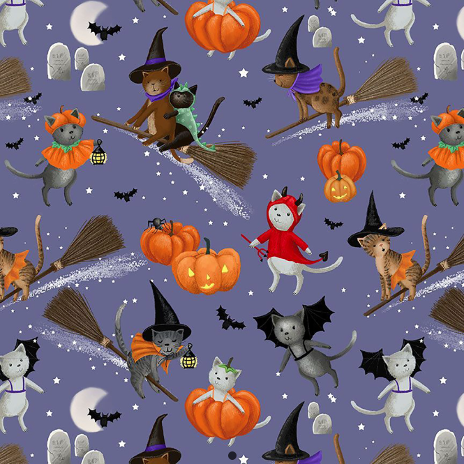 Les activités purranormales n'ont jamais été aussi mignonnes ! Ces adorables chatons sont tous déguisés et prêts pour les festivités d'Halloween, allant de leur envol à travers le ciel nocturne à l'exploration d'un champ de citrouilles dans une palette fantaisiste de orange, gris et bleu crépusculaire.