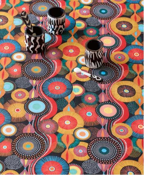 Les motifs de cercles qui ornent ce tissu s’inspirent des célèbres motifs du wax africain, apportant une touche vibrante et dynamique. Les cercles, de différentes tailles et couleurs, créent un effet visuel captivant, évoquant la richesse culturelle et l’artisanat traditionnel. Les teintes font de ce tissu un choix parfait pour des créations originales et modernes.