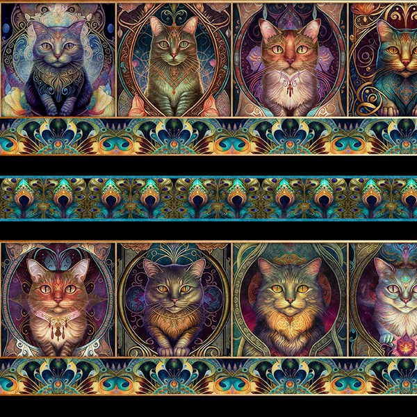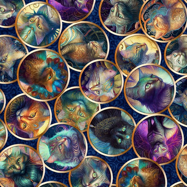 Feline Fantasia de Dan Morris pour les tissus Quilting Treasures présente des chats fantastiques dans des nuances éthérées de sarcelle, turquoise, bleu marine, violet, vert émeraude, noir et or.
