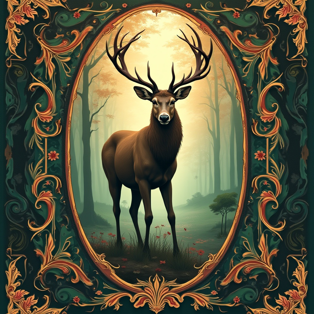Version achetée: COUPON CERF CADRE OVAL ACANTHE FOND VERT 20X20 - tissu 100% coton - CARRE COTON ENVIRON 20X20