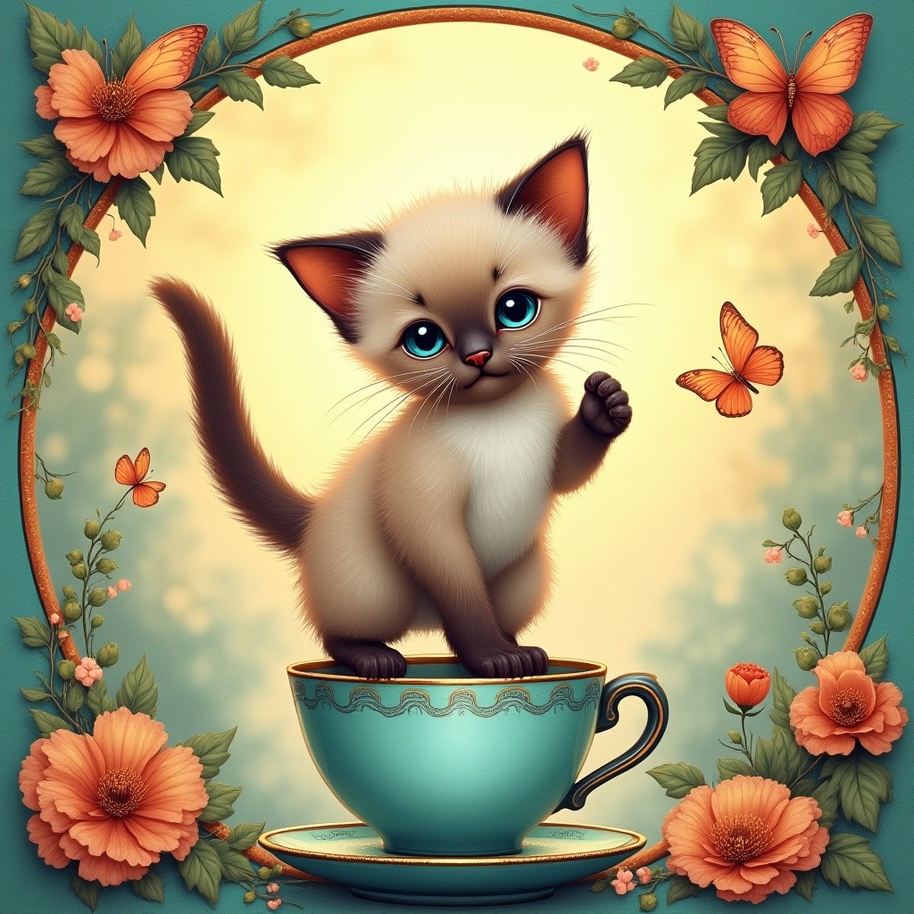 COUPON CHATON SIAMOIS SUR TASSE ET PAPILLONS 20X20 - tissu 100% coton