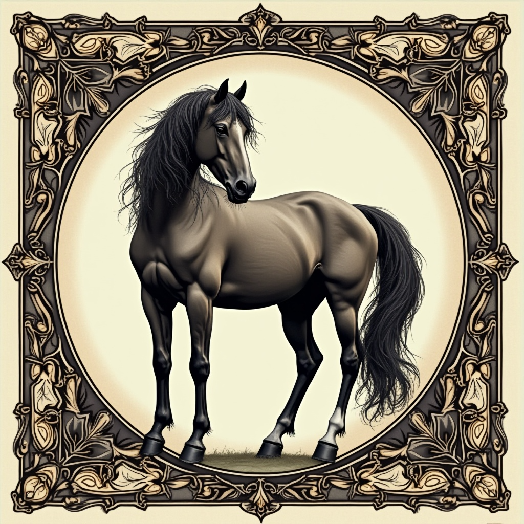 COUPON CHEVAL BRUN CADRE ART NOUVEAU FOND BEIGE 20X20 - tissu 100% coton