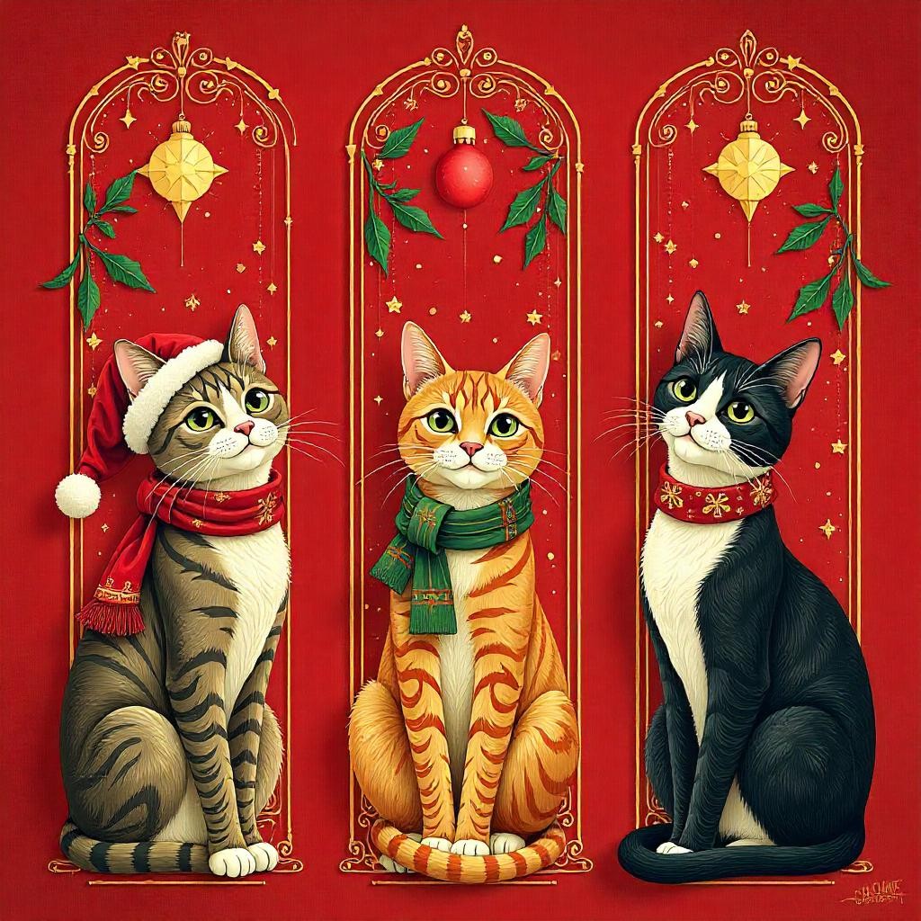 COUPON SIGNETS NOEL TRIO CHATS FOND ROUGE 20X20 - tissu 100% coton
