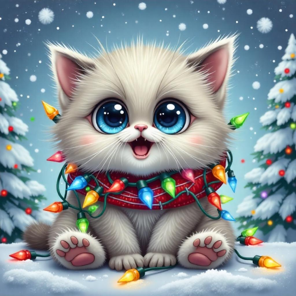 COUPON CHATON BLANC YEUX BLEUS GUIRLANDE NOEL 20X20 - tissu 100% coton