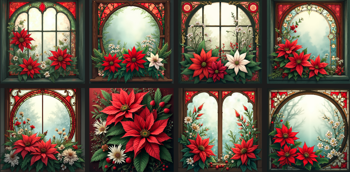 Ensemble de 8 coupons 13X13 POINSETTIAS A LA FENETRE à coudre pour lingettes - exclusivité Nadège Tissus