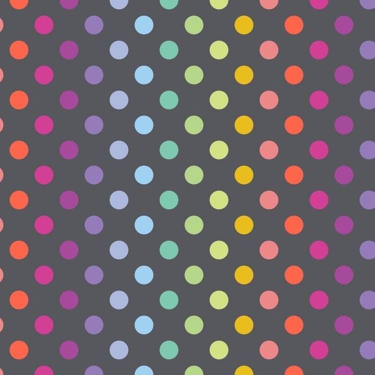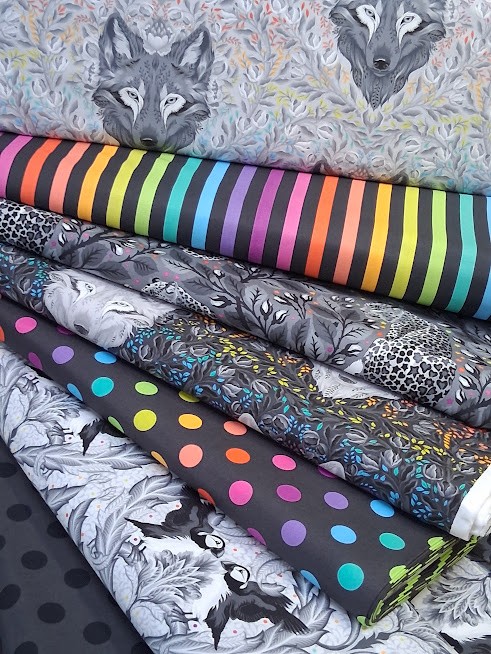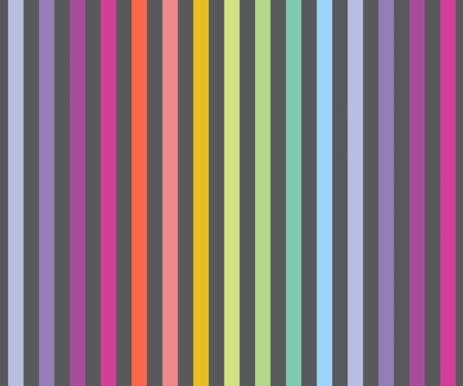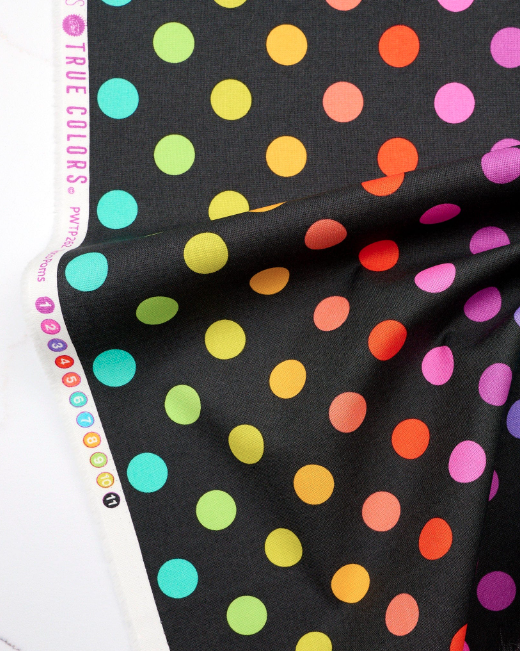 Les tissus coordonnés sont des variations des tissus True Colors existants, afin de connecter les tissus et remplir le dégradé de gris. La bande multicolore est de retour à la fois sur un fond gris doux et un gris charbon, et les pois Pom Poms ont été ajoutés à la fête dans une nouvelle version arc-en-ciel pour s'accorder avec les rayures !