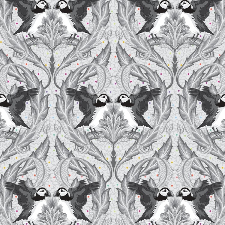 Pour les tissus principaux de la collection, des animaux qui vivent leur vie en nuances de gris : loups, ours, léopards des neiges, macareux et lions de mer, remplis de détails.
