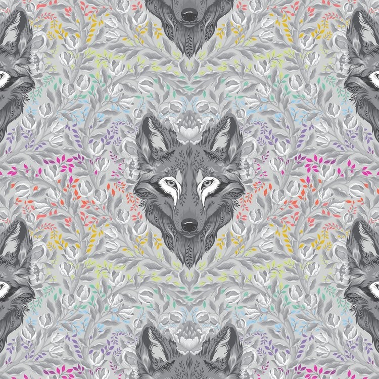Pour les tissus principaux de la collection, des animaux qui vivent leur vie en nuances de gris : loups, ours, léopards des neiges, macareux et lions de mer, remplis de détails.