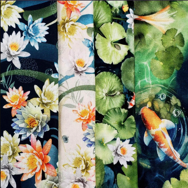Un tissu délicatement orné de nénuphars stylisés, déployés en larges pétales. Les fleurs semblent flotter avec grâce, chacune subtilement ombrée pour donner une impression de volume et de légèreté. Le fond se compose d’un camaïeu de verts et de bleus profonds et nuancés se fondant les uns dans les autres comme des reflets aquatiques. L’ensemble crée une atmosphère chaleureuse et apaisante, rappelant un étang au coucher du soleil, où les couleurs se mêlent dans une harmonie végétale raffinée.