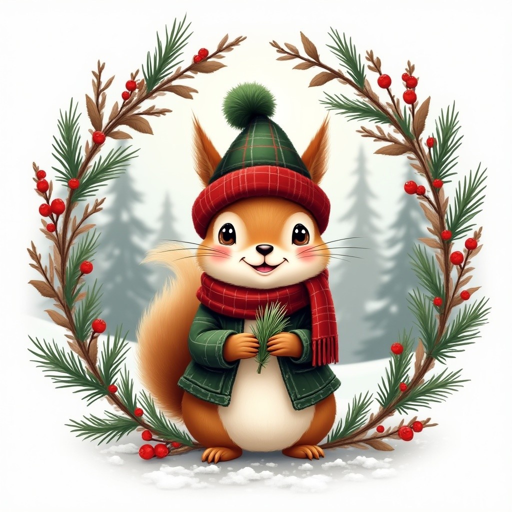COUPON ECUREUIL COURONNE NOEL VESTE VERTE 20X20 - tissu 100% coton
