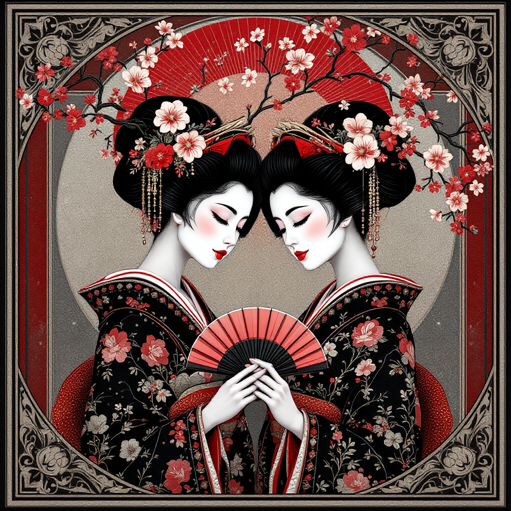 COUPON DUO GEISHAS EVENTAILS GRIS ROUGE 20X20 - tissu 100% coton