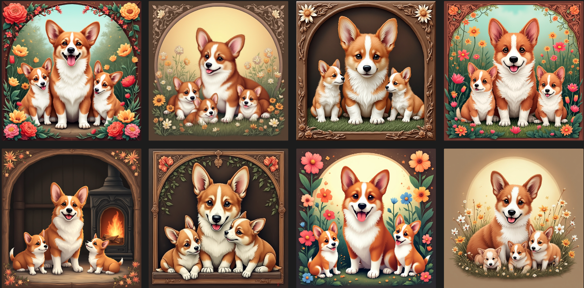 Ensemble de 8 coupons 13X13 CORGIS FAMILY à coudre pour lingettes - exclusivité Nadège Tissus