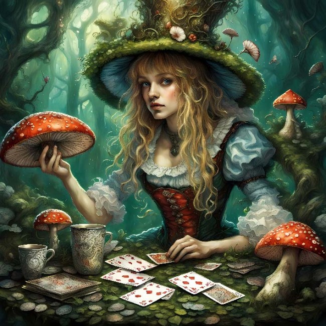Alice's dream collage de Timeless Treasures Fabrics est un tissu fantaisiste inspiré d'Alice et de ses curieux compagnons.