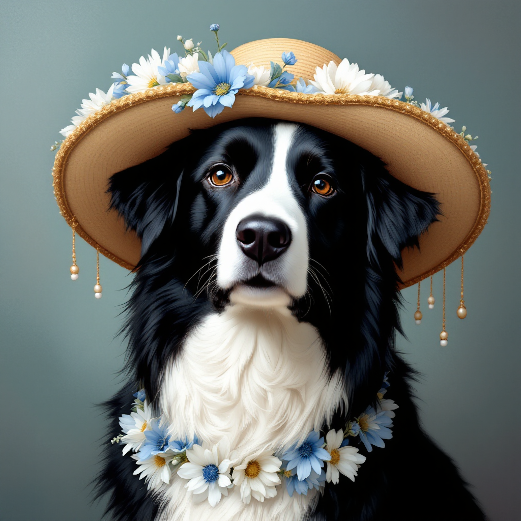 COUPON BORDER COLLIE CHAPEAU FLEURS BLEUES 20X20 - tissu 100% coton