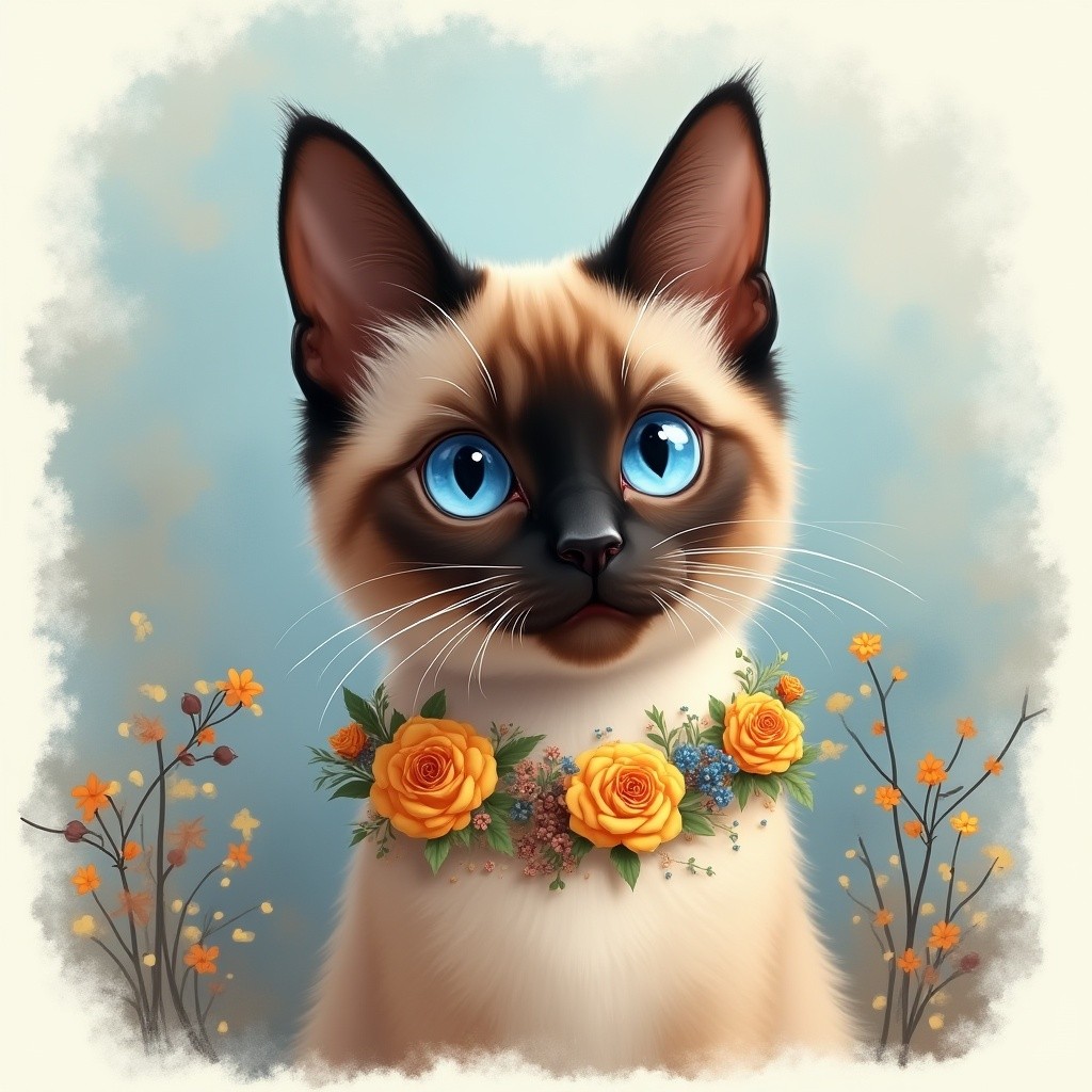 COUPON CHATON SIAMOIS CARTOON COLLIER FLEURS JAUNES 20X20 - tissu 100% coton