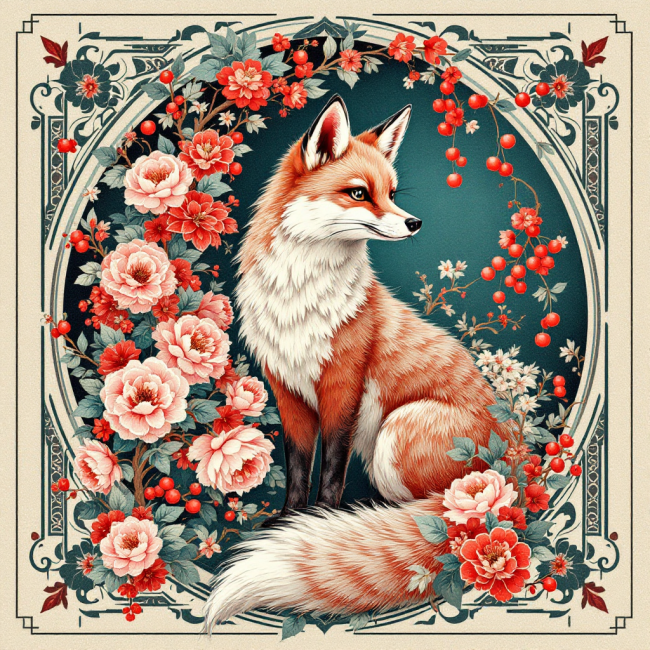 COUPON RENARD KITSUNE ET PIVOINES CADRE BEIGE 20X20 - tissu 100% coton