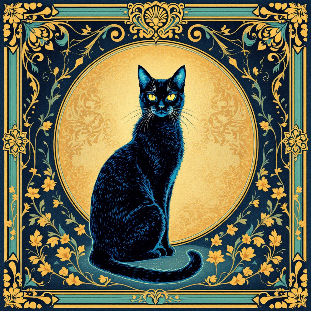 COUPON CHAT NOIR ART NOUVEAU BLEU GOLD 20X20 - tissu 100% coton