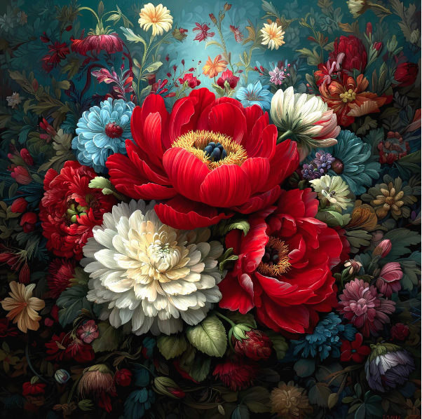 Carré BOUQUET PIVOINES ROUGES 40X40 - polyester IMPERMEABLE