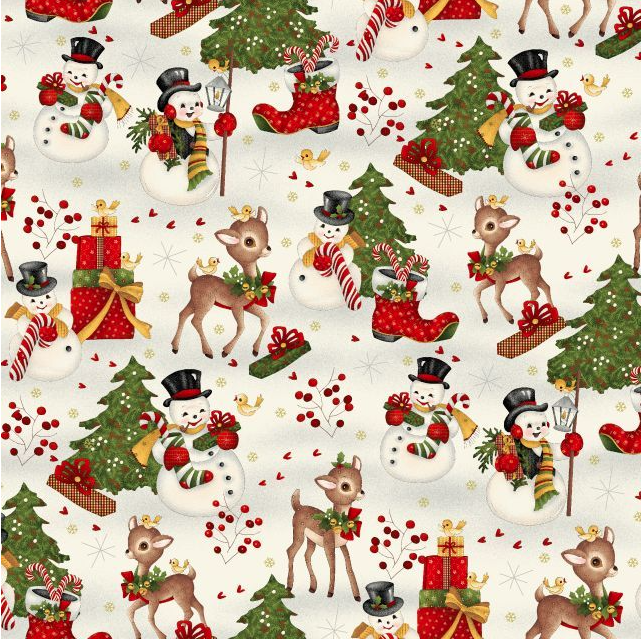Winter Joy – Henry Glass Fabrics est une collection de tissus de Noël pleine de tendresse et de magie hivernale. Elle met en scène d’adorables bonhommes de neige souriants, emmitouflés dans leurs écharpes colorées, ainsi que de mignons petits faons de Noël, espiègles et délicatement illustrés, qui apportent une touche de fantaisie et de douceur à l’ensemble.