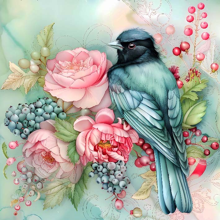 Carré OISEAU PIVOINES TURQUOISE 45X45 - Velours Manille