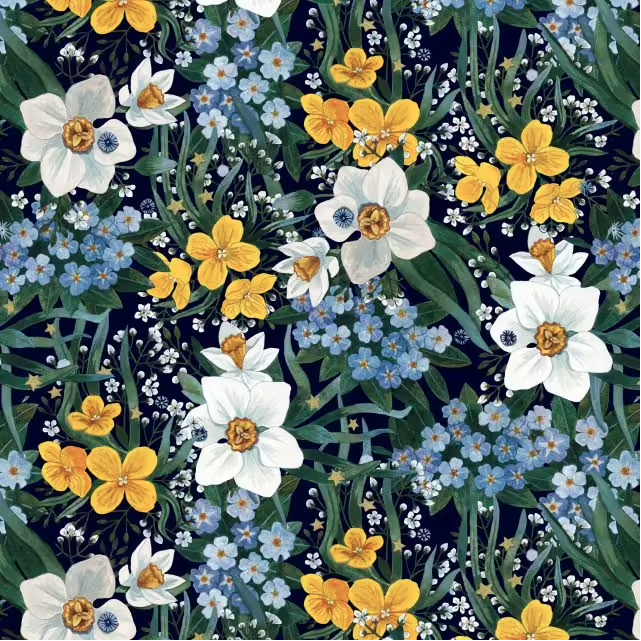 Inspirée par les mystères des jardins nocturnes et par les insectes et fleurs qui les habitent, Nocturnal Creatures de Maria Matos est une exploration poétique de la vie cachée de la nature après la tombée de la nuit, rendue à travers des formes complexes et des détails d’une beauté envoûtante. La palette de couleurs reflète des tons profonds de bleu nuit et de noir intense avec des touches de jaune d'or et de rouge. Les textures suggèrent la délicatesse des ailes d’insectes et l’entrelacement des branches et des fleurs.
