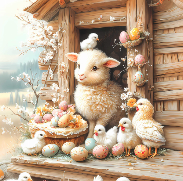 Carré CABANE AGNEAU ET POUSSINS - velours premium