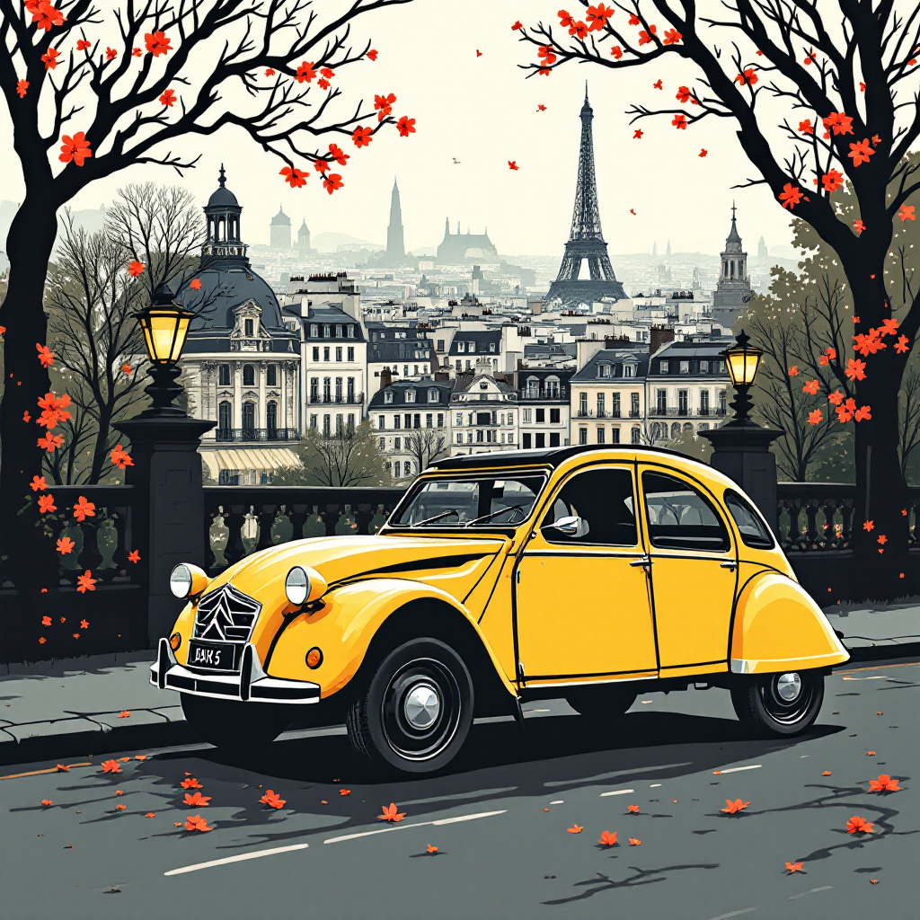 COUPON 2CV CITROEN JAUNE PARIS 2 REVERBERES JAUNES 20X20 - 100% coton