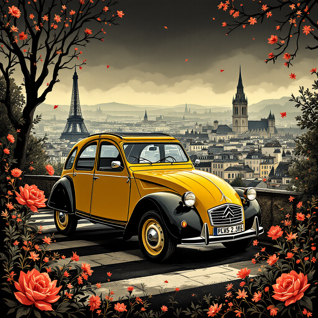 COUPON 2CV CITROEN CHARLESTON JAUNE PARIS DE NUIT 20X20 - 100% coton