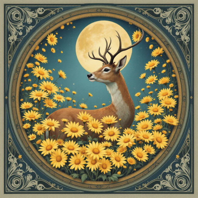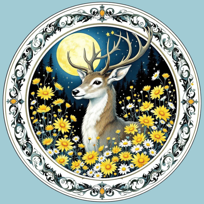COUPON CERFS FLEURS DE PRINTEMPS JAUNES FOND BLEU 20X20 - 100% coton