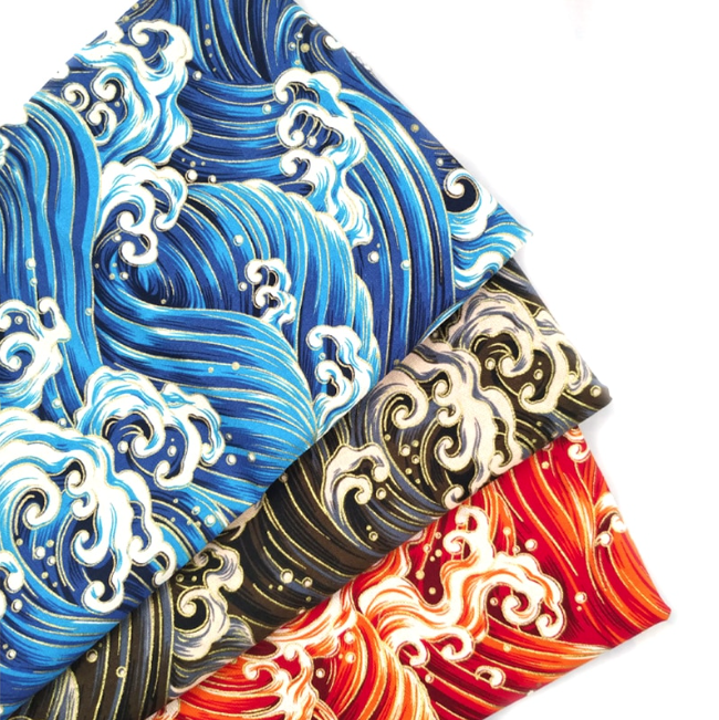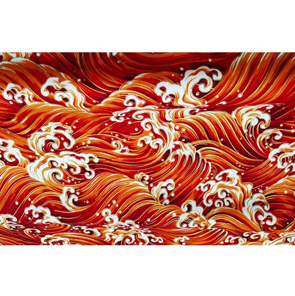 Un tissu japonais élégant inspiré de la célèbre vague de Kanagawa, revisité dans une palette chaleureuse de rouges profonds et d’oranges vibrants. Les motifs dynamiques de la vague sont délicatement rehaussés de touches de foil doré, apportant éclat et raffinement. L’ensemble évoque à la fois la puissance de la mer et une esthétique luxueuse, idéale pour des créations à la fois traditionnelles et contemporaines.