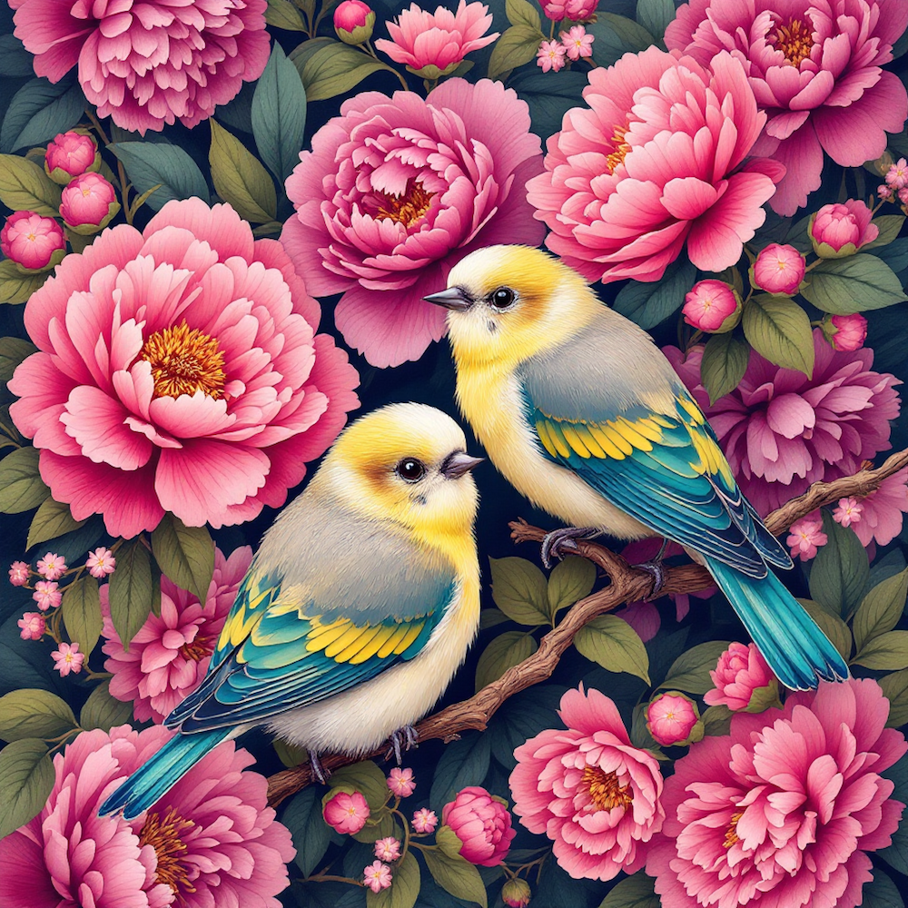 Carré 20X20 COUPLE MESANGES PIVOINES - polyester résistant souple infroissable (210gr/m2)