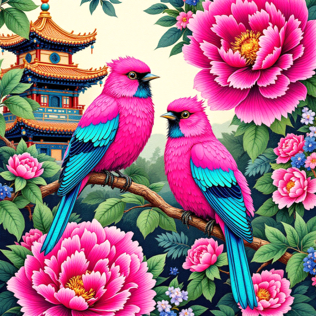 Carré 20X20 COUPLE OISEAUX PAGODE - polyester résistant souple infroissable (210gr/m2)