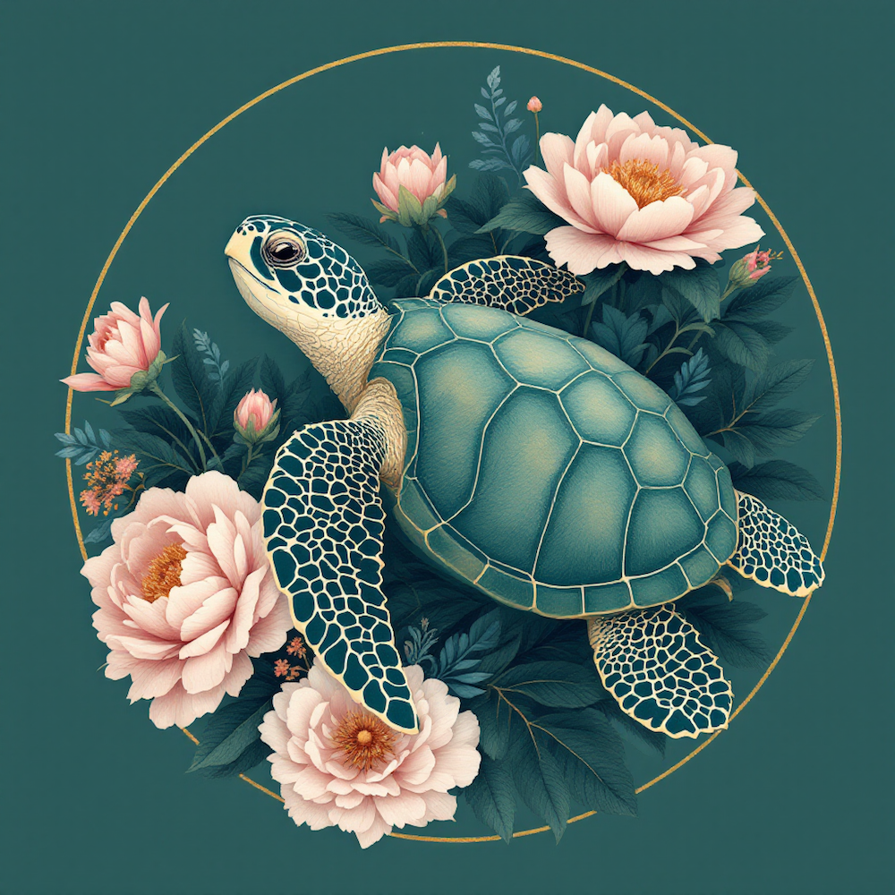 Carré 20X20 TORTUE DE MER PIVOINES - polyester résistant souple infroissable (210gr/m2)