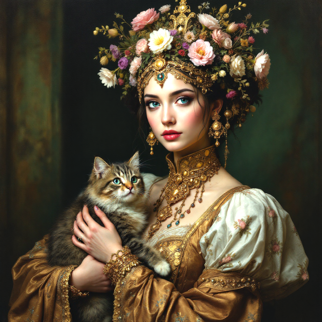 CARRE 20X20 CHAT NORVEGIEN AVEC FEMME BAROQUE - cretonne 100% coton (156 gr)