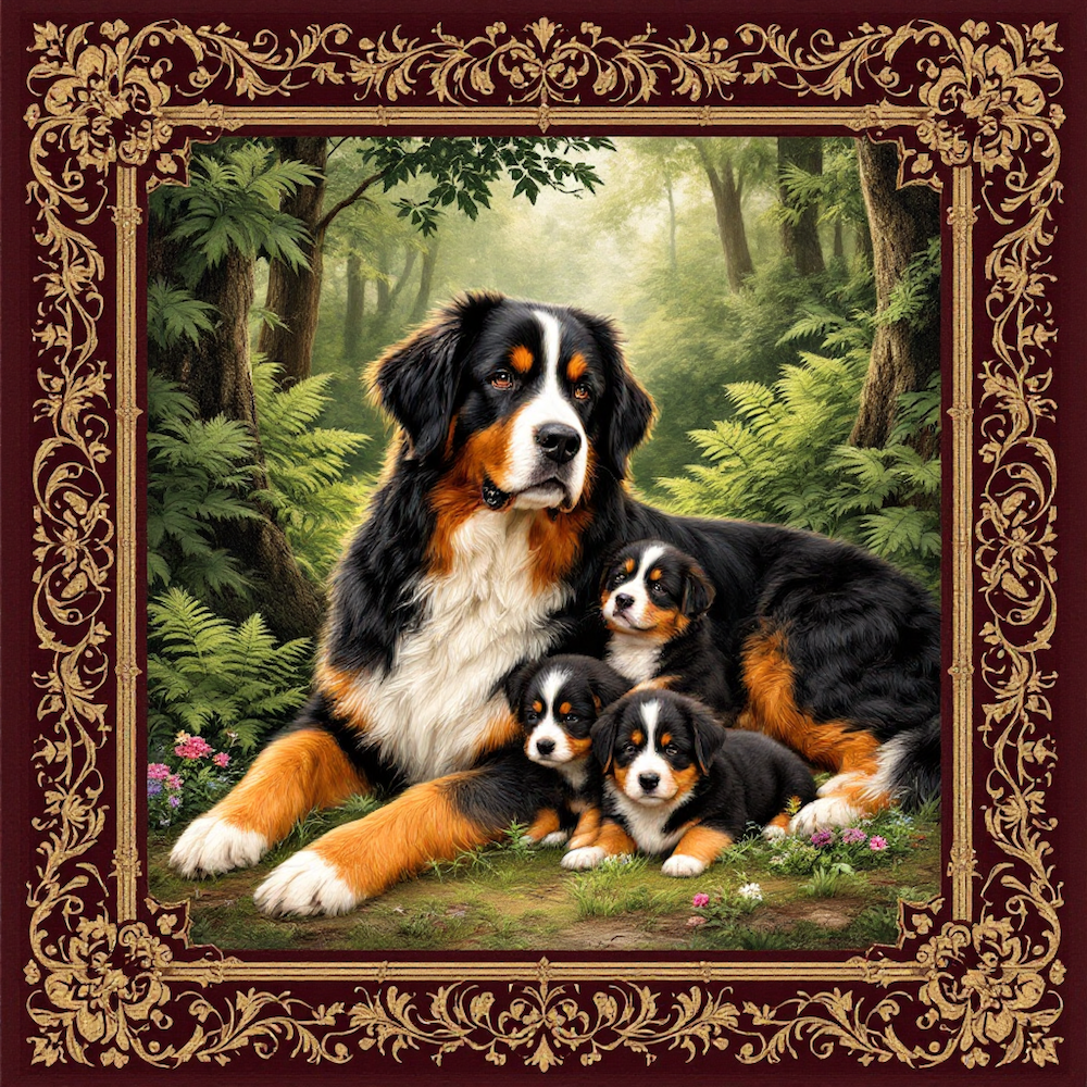 CARRE 20X20 BOUVIER BERNOIS 3 CHIOTS - cretonne 100% coton (156 gr)
