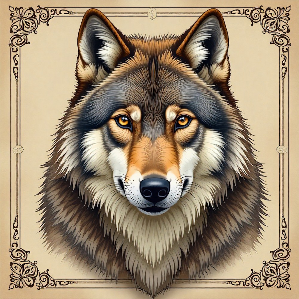 CARRE 13X13 LOUP BRUN DE FACE - simili cuir (550 gr)