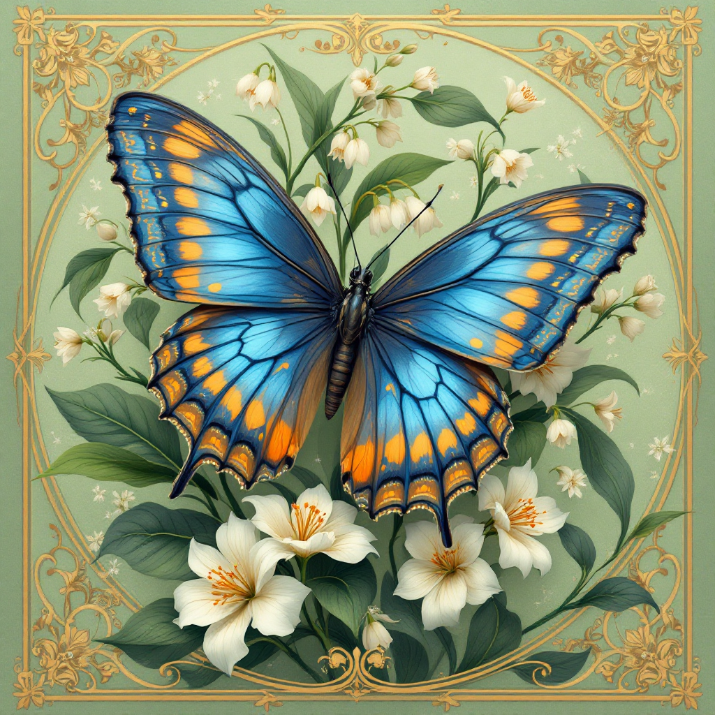 COUPON PAPILLON ORANGE BLEU FOND VERT 20X20 - 100% coton