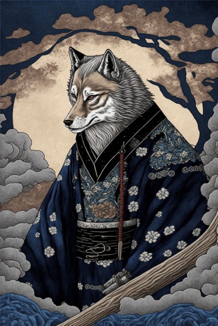 Panneau LOUP KIMONO INDIGO 27X40 - tissu 100% coton