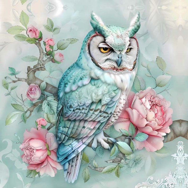 Carré CHOUETTE PIVOINES TURQUOISE 45X45 - Velours Manille